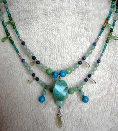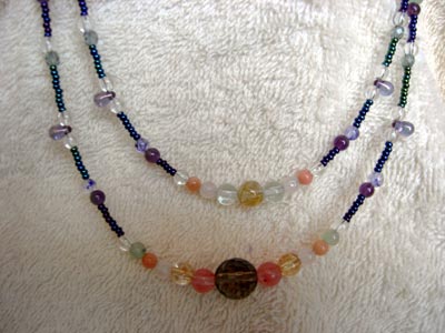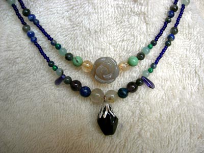 これは濃い青のビーズと寒色系の石を使ってみました。
