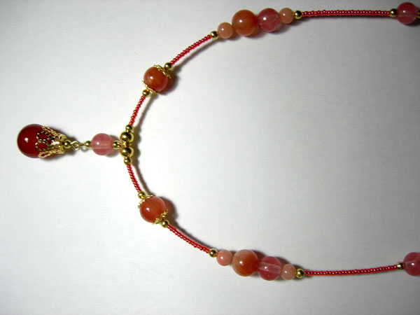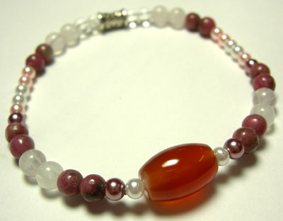 石は4ミリのロードナイト(薔薇輝石)とローズクオーツ(桃色水晶)、3ミリの水晶、他はグラスパールです。