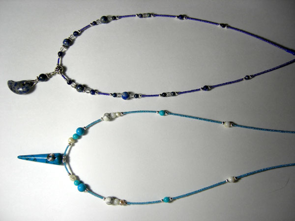 上の紺色の方はソーダライトとラピスラズリ、水色の方は練りターコイズとブルーカルセドニー、あまり高い石は使っておりませんσ(^◇^;)