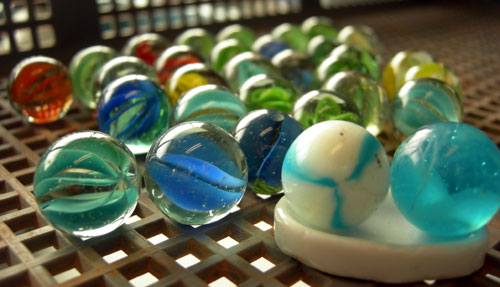 ところで写真のビー玉なのですが、私の記憶の物に比べると、随分と中の波模様が細かくて多いようですし、色味も何となくヴァリエーションがあるようです。