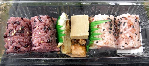 黒米と赤米のおにぎりに、魚の干物や漬物が少し、そして真ん中の四角いのは『蘇』です。
