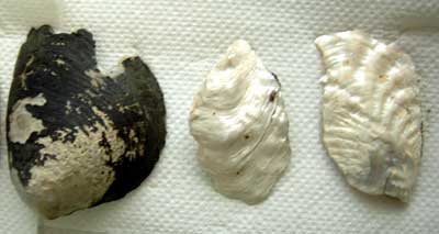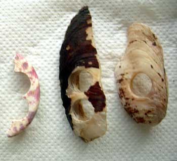 巻貝の話はさて置き、真ん中下の丸いのが、くり貫いたボタンの原型です。