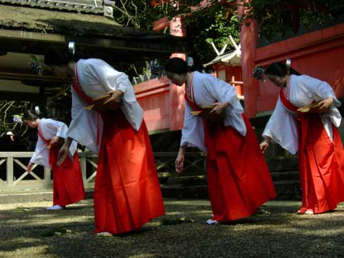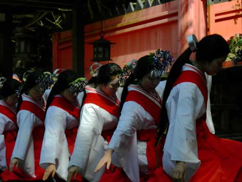 しばらく眺めておりますと、11時過ぎに御神子(みかんこ;巫女)さんとお田植えをする人たちが入場して、一緒にお祈りの後、鋤やら鍬やらを持って、再び本殿の方へと帰って行きました。