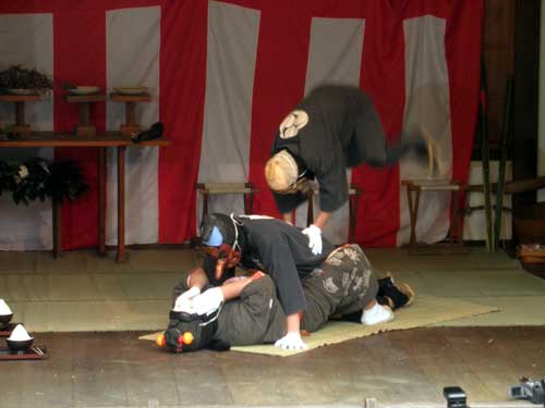 そしてこの後、後の三人が観客に向かって、この苗(例に漏れず松葉の束です)を投げます。