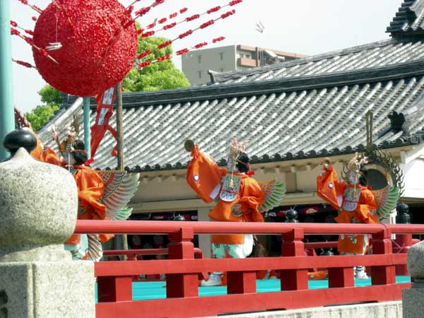 このかなり変化の無い舞(既に舞は失われて、二頭の獅子は舞台の上を歩いて回るのみです)が終わると、ようやくテンポの良い曲にのって、左方の童舞(わらべまい)の『迦陵頻(かりょうびん)』が始まります。