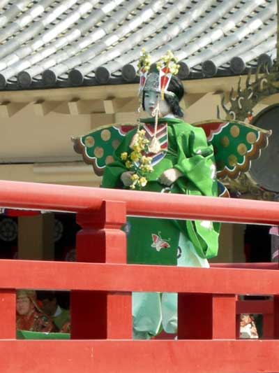 小学校の低学年と思しき男の子が六人、このように付け髪をし、化粧もして鳥の翼を背負った装束で舞います。