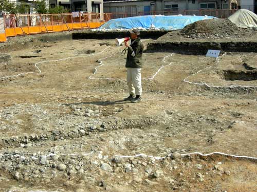 先日に新聞をにぎわせた、外京において始めて交差点が確認されたという調査成果が上がったのが、今回三月八日に現地説明会の行われた発掘現場です。
