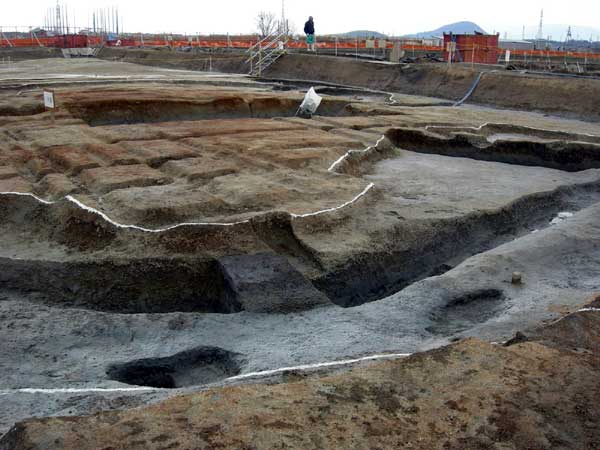 今回は遺跡の分布を調査するために、東西方向、南北方向に長細いトレンチを入れているのですが、この限られた範囲内で、幾つかの建物の跡が検出されています。
