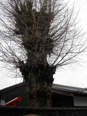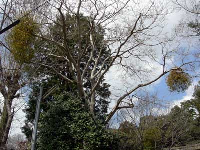 この鳥居の前に、大きなヤドリギのある木が立っていました。