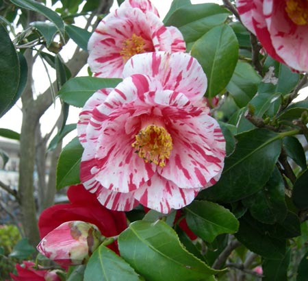一本の木なのに、白や赤、絞りなどの様々な八重の大輪の花をつけるので有名です。