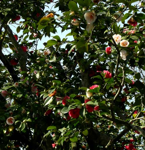 なかにはお茶の花を倍以上に大きくしたような白い一重の花もあって、今更にお茶は椿と同じ品種だったんだと確認してしまいました。