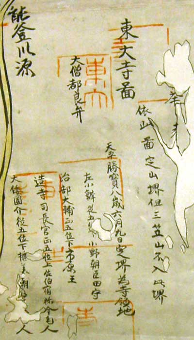 それはさて置き、上の画像は何かと申しますと、奈良女が所蔵している『東大寺山境四至図』の模造品の一部です。