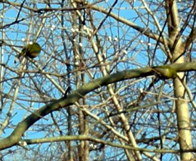 そして三番目の物は、白い木の実をついばんでいた目白の群れをデジタルズームをめ一杯にして写したのですが、ピントがやたらに甘いです(^_^;)