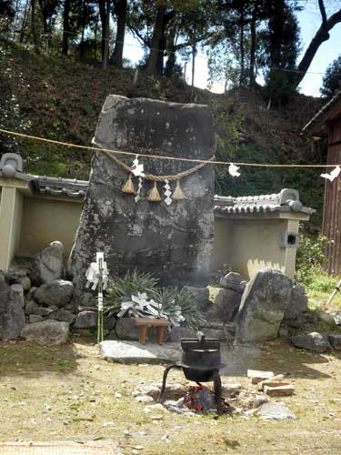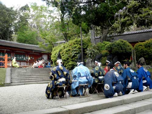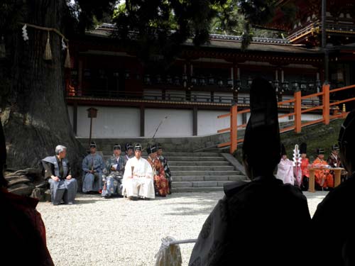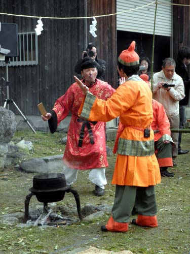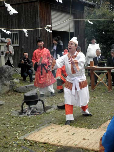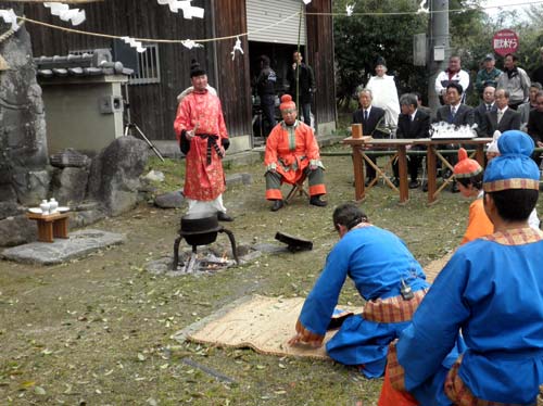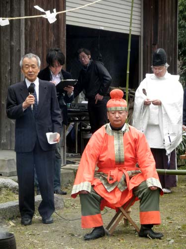 祭は明日香村の豊浦と雷の大字の方々が氏子として行っていましたが、もう少し見ても分かり易く面白い物にしたいと、考古学者で有職故事を研究している猪熊兼勝先生にプロデュースして頂き、衣装も調えて、境内の『立石』の前で寸劇を交えて神事を行っています。