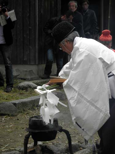 『立石』の前に据えた釜では湯が沸騰し、宮司がその中に米と酒と塩を注ぎ、笹の葉を浸して参加者に御祓いをします。