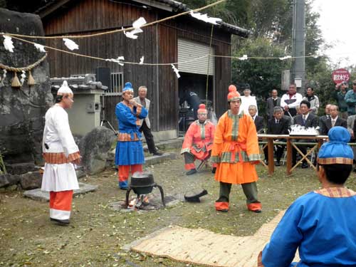 神事の後に行われた寸劇は、この様子を面白おかしく見せてくれます。