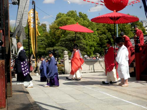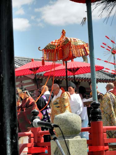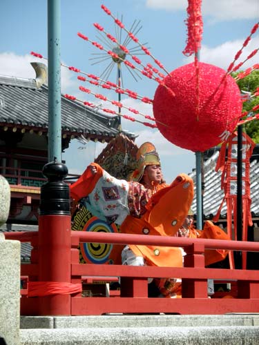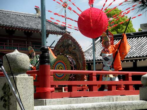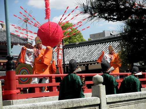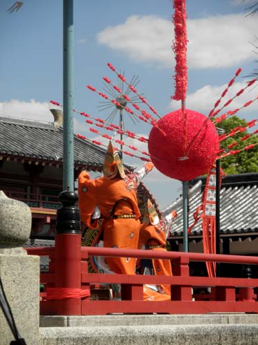 右方の舞楽『蘇利古(そりこ)』は、一般的には四人舞いだそうですが、四天王寺では五人で舞う事が恒例化しているそうです。