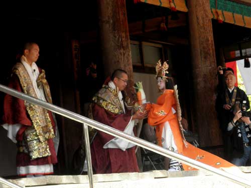 そして門を出てすぐの辻で、左方と右方に別れて六時堂の横を回り込み、池も越えて、正面から石舞台に上って舞台前庭儀(ぶたいぜんていぎ)を行います。