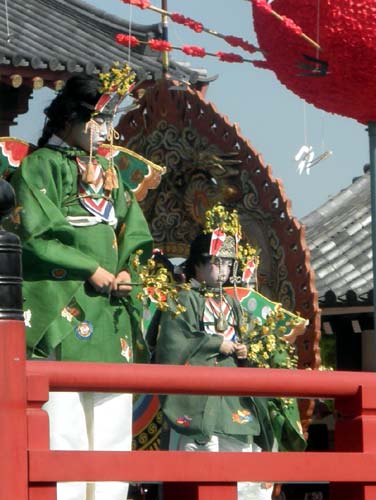 この時、舞台には四人の左方の舞人が登場し、舞楽『萬歳楽(まんざいらく)』が舞われています。