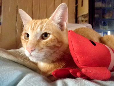 前脚で抱えて、後脚で蹴っ飛ばして遊ぶ、そういうおもちゃでキャットニップが入っているとか。