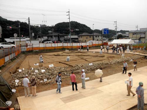 現在の成果では、春日神社の南側一帯で検出された建物群や、東西方向の回廊かもしれない柱列などから、春日神社の辺りが遺跡の中心と見られているようです。