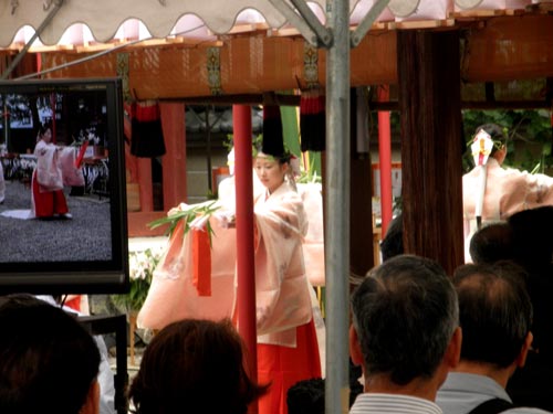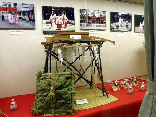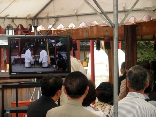 ところでこのお祭、かなり古い形式を残しているようで、二枚目の画像のモニターで二人の神職が運んでいる御棚(みたな)は、黒木という枝を組み合わせて作られています。