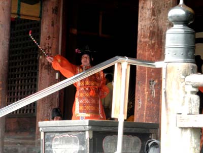 『四箇法要』が終わるとお馴染みの『長慶子』(ちょうげいし)の音に乗って、高座から下りて六時堂の中に戻られます。