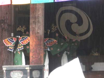 私が眺めていた場所は、左方の楽所のすぐ脇だったので舞は遠いけれど楽は近い、雨さえ降っていなければ案外良いポジションだったと思うのですがね。