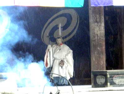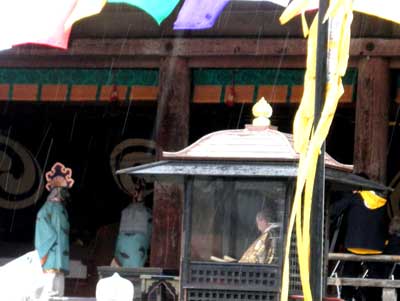 本来ならば、御堂から出て来た御僧侶が石舞台の前で祭文の奏上を行うはずなのですが、雨のため御堂の縁で奏上が行われました。