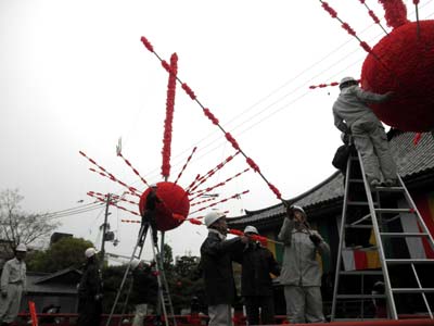 枝を下ろすだけで、和紙の赤い花びらのノリがはがれ、あちらこちらに散らばりますので、散華の代わりに何枚か拾って帰りました。