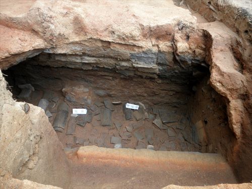 焚口の右側にやや白っぽい粘土が見えますが、山の斜面のこの部分までを掘り込んでいます。燃焼室や焼成室は日干し煉瓦状の粘土ブロックを持ち送りにして、ドーム天井を築いています。横穴式石室の石積みの代わりに、粘土ブロックを積んで造っている様な状態です。そして、裏込めに白っぽい粘土を充填しています。