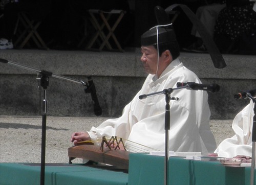こちらも春日大社での演奏です。滅多に見る事はありませんが、座って弾く例です。演奏者は安座し、右膝の上に左足を乗せます。その上に龍手を乗せて、膝の上に横たえる形で演奏するそうです。