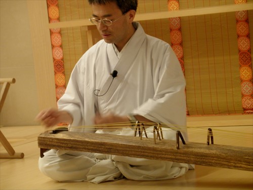 もう一例は橿原神宮の久米舞の伴奏に使われている和琴です。こちらは台の上に置いた楽器を椅子に腰かけて弾いています。