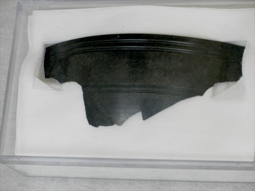 遺物は須恵器や瓦がありますが、全体的に少ないようです。特筆すべき遺物として、礎石抜取穴の一つから、このような佐波理鋺(さはりわん)の口縁部破片が見つかっています。飛鳥時代の物で、厚さは0,3~0,4㎜しかないそうです。見つかった抜取穴の位置で、平安時代の耕作溝が止まっているので、その頃にはまだ礎石が残っていたようです。