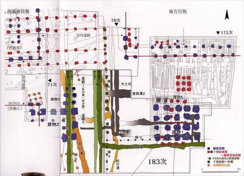 この遺構図の実線で囲まれた183次と書かれている個所が、今回の調査区です。色分けは時代分けを示しています。青紫が藤原宮期、赤が7世紀後半から宮造営期、緑は同時期でも赤の遺構に切られているので、それより古い時期になります。グレーはそれ以前の7世紀前半から中期、黄色は西方位に乗らない事もあり、古墳時代かそれ以前の遺構だと考えられます。