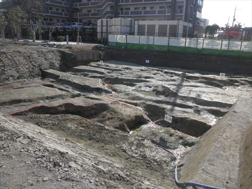 中央の高く平らな場所は江戸時代の道路面です。その左側(東側)に環濠が掘られています。これ外環濠です。東側の肩は既に判明しているので、内環濠と共に復元されています。しかし今回検出するはずだった西肩は、昭和に入ってからの配管工事で既に壊され、一部分での検出に留まっています。