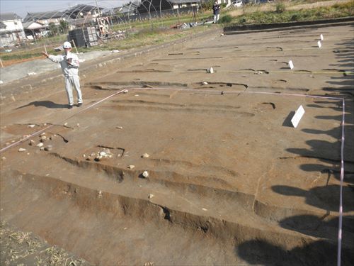 手前のピンクのテープが、建物の東端です。柱の跡はまだ掘っていません。奥には塀になると思われる柱穴が二列並び、さらに奥には、並行して溝が見つかっています。