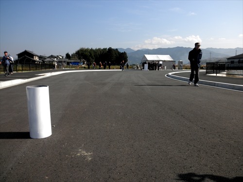 既に舗装の済んだ道路面に置かれている筒は、大型建物の西端の柱位置を示しています。奥に見えるテントの左側が調査地です。さらに奥の木立は『馬立伊勢部田中神社』の杜です。