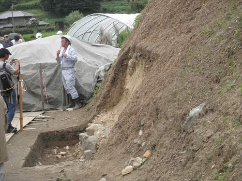 この画像は、焚口の側から見たところです。奥壁のように見えているのは未発掘の部分で、この埋土を取り除いてしまうと、天井が崩れてしまうので残してあります。その上には、煙道の穴が丸く見えています。