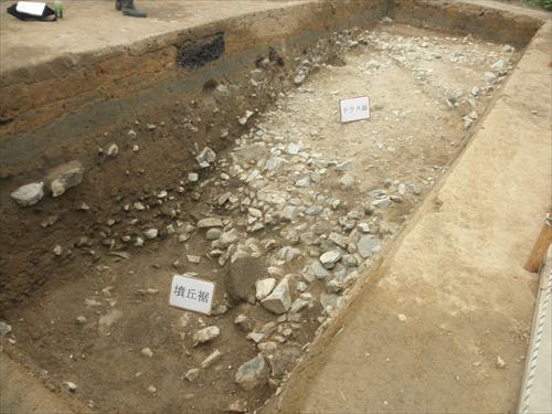 この調査区は墳丘の北側コーナーを含む北東面に当たりますが、開口部(正面)から見ると反対側なので、造りはやや雑です。画像の上の方に見える溝が周濠ですが、幅は1m程度、深さも40cmほどの空堀です。その奥に石を置いて護岸を築いています。