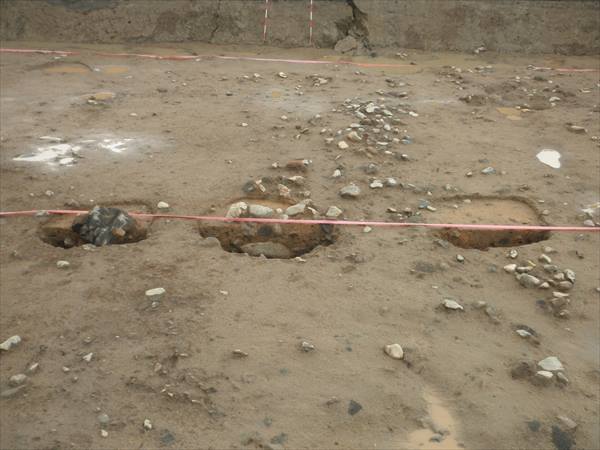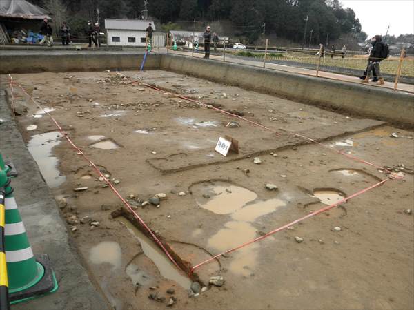 今回見つかっている石敷きは、これらの柱穴を埋めた後に敷かれたという事です。