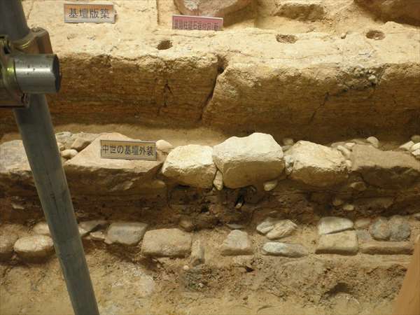 基壇その物の残りも極めて良く、25層にも及ぶ入念な版築(はんちく)によって築かれている事も分かりました。版築の下の部分は粘土を突き固め、上の方は砂と粘土を交互に固めるという方法で作られています。上下で色の違いが見えるのはそのためです。