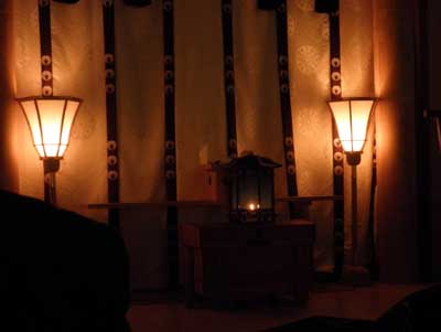 青いガラスビーズを簾のように連ねて火袋にした物ですが、現在の物はガラスビーズではなく青い絹の布が張られていまして、こちらはこちらでなかなかに美しい物です。