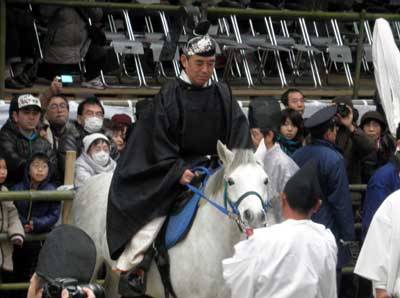 風流行列の内で唯一、黒い束帯を身に着けている騎馬の人物ですので、すぐに分かります。