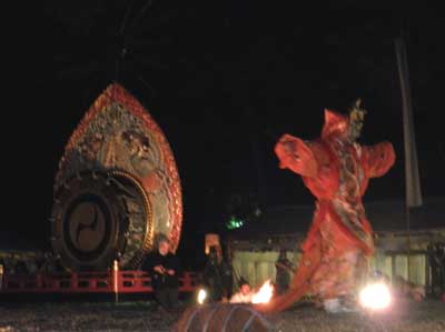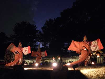 舞楽『蘭陵王(らんりょうおう)』と『納曾利(なそり)』は、勝負舞といいまして、日中に行われる競馬の勝敗によって、奉納の順番が変わります。