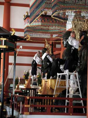 そして金堂が終わりますと、大講堂の諸仏、更には東院堂の聖観音像なども拭いて行きます。