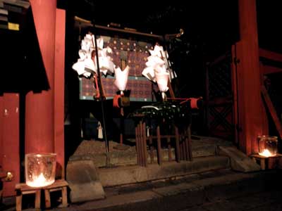 さて、境内では『夕座の儀』が終わった辺りから、恒例(今年に限り、毎月1日に行っています)の『氷献灯』に火が入れられ、『東遊』の終了した19時前にはこのように見事に映えていました。