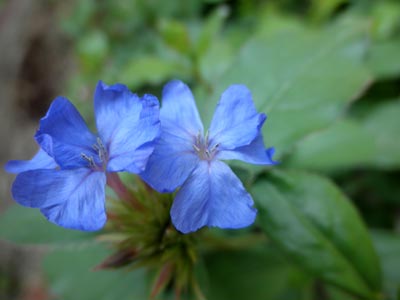 ハレーション気味の画像ですが、後ろが『ルリマツリモドキ』、手前の一輪が『ブータンルリマツリ』です。