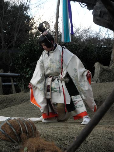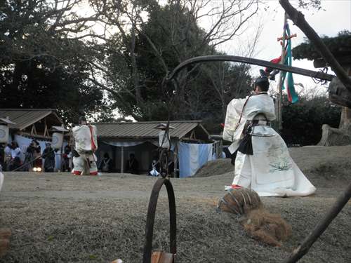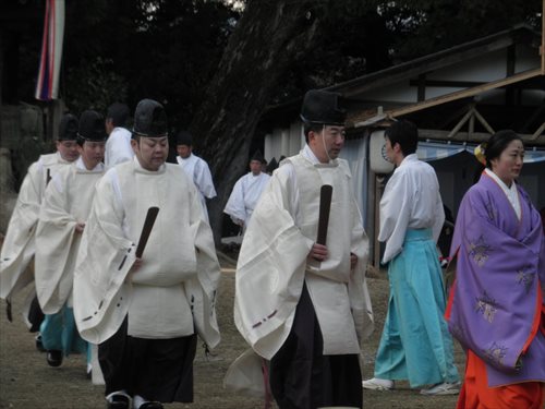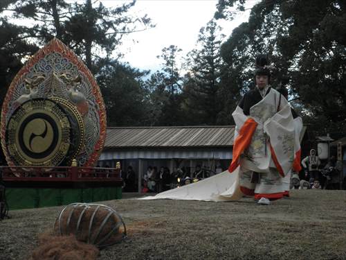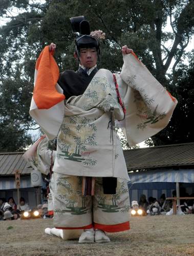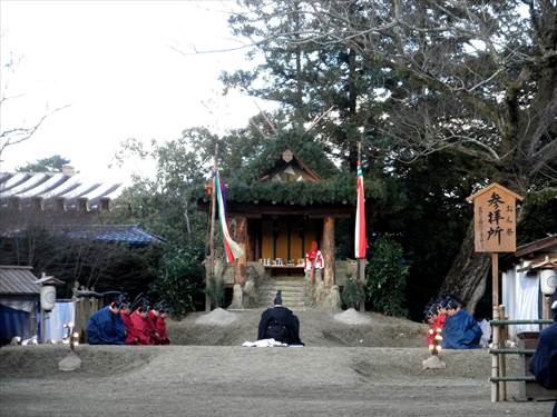 芸能者たちがやって来ると、神職の方々が若宮様に祭りが始まりますという挨拶をします。こうして、お旅所祭が始まります。お供え物を奉り、宮司が祝詞をあげ、勅使代行の日使(ひのつかい)が御幣を奉り、参列者代表が玉串を捧げた後、神遊(芸能)が始まります。
