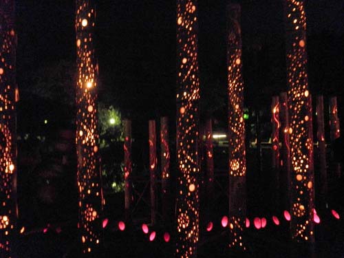 孟宗竹に大小の穴を開けて、節の部分にロウソクを入れたランタンです。